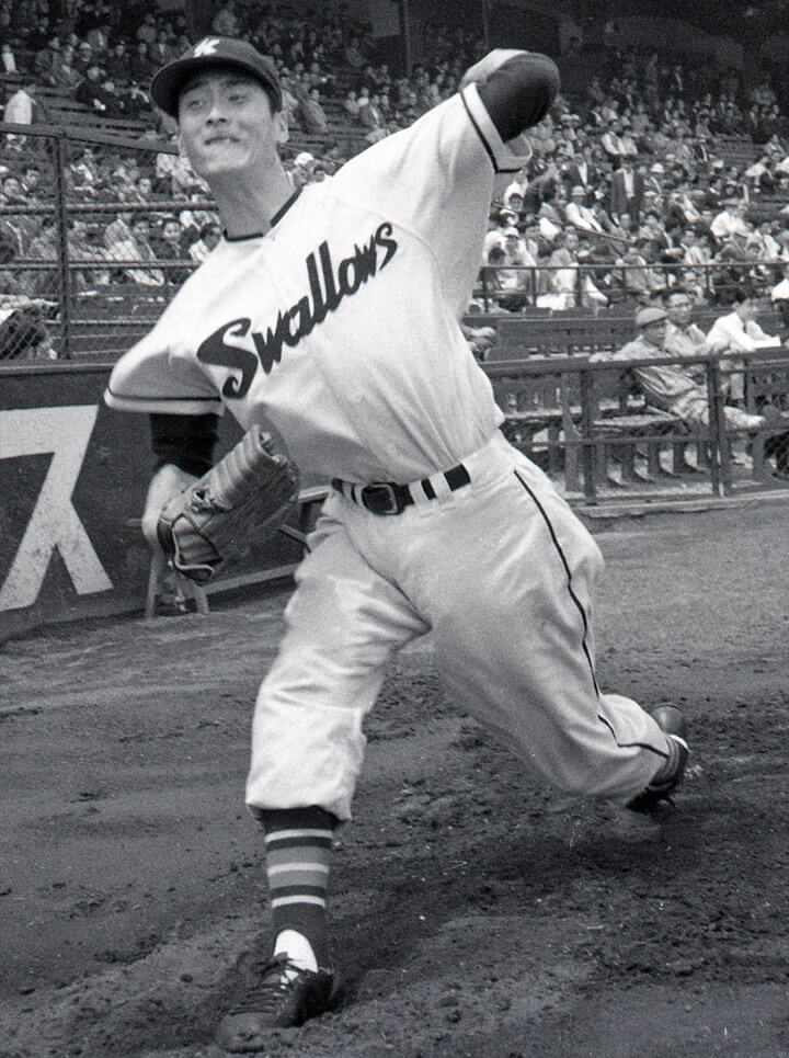 で、1955~1956年と2年連続で奪三振王に輝きますが、この2年間は350、316奪三振で、1957年も306奪三振でしたが大洋ホエールズの秋山登投手に312で奪三振王を奪われ、この年も僅かに6奪三振の差。